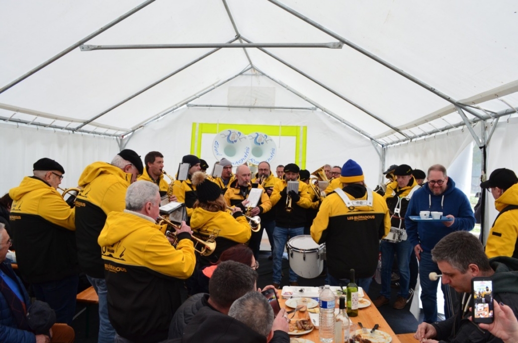Plus de 250 repas avec du cochon à la broche ont été préparés et servis au Chouette Parc et sous les barnums pendant que les Buffadous faisaient résonner des airs de bandas.