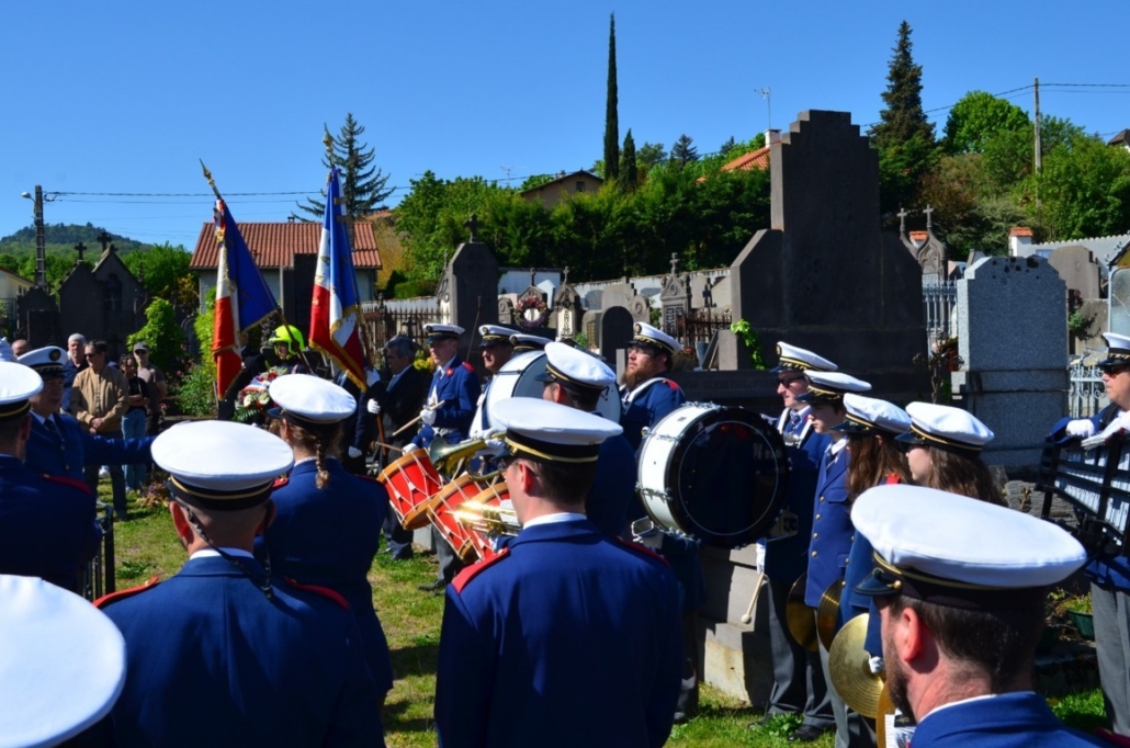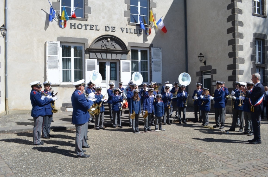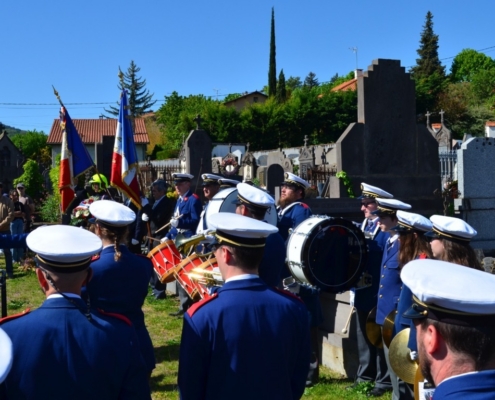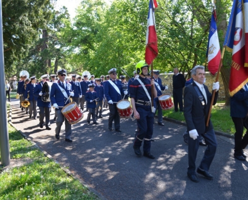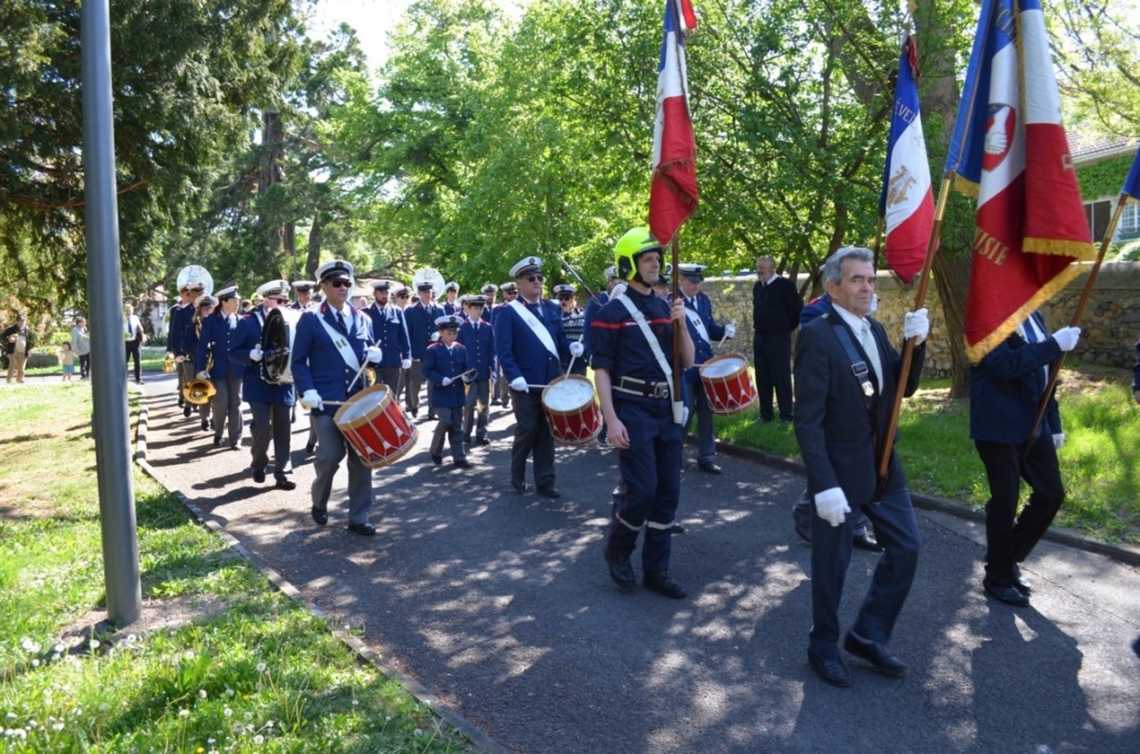 La cérémonie débuta à la Mairie. Puis le cortège s’est rendu au cimetière pour le traditionnel dépôt de gerbe pour un retour, toujours en défilant, jusqu’au parvis de la Mairie.